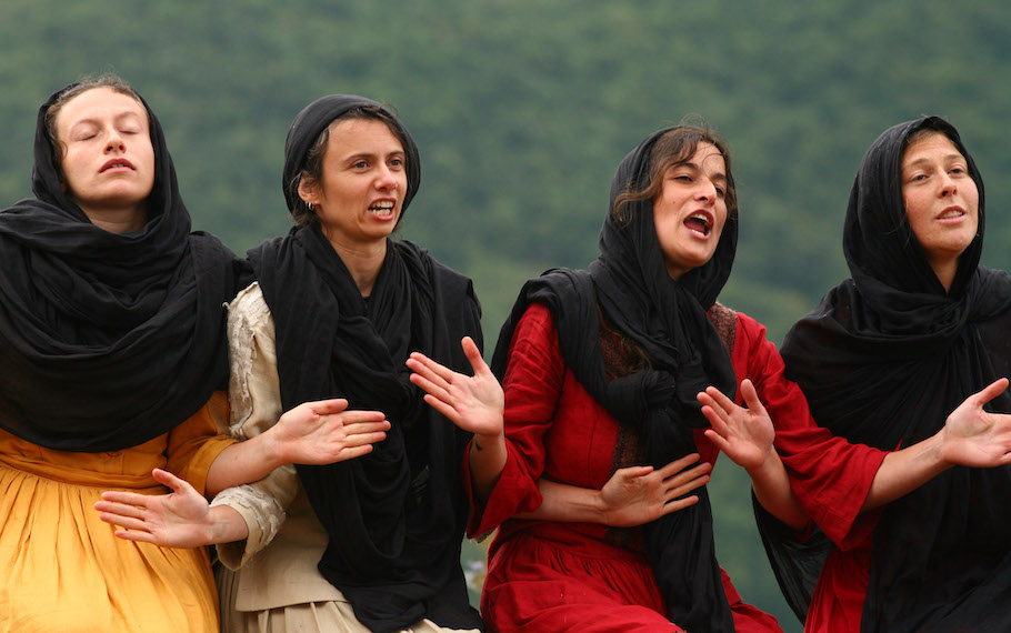 DANZO’ DANZO’ è uno spettacolo teatrale itinerante che mette in relazione il bosco, dal tramonto al buio, con alcune tra le più note fiabe della tradizione: Scarpette Rosse, Manawee, Pelle di foca-Pelle d’anima, La Loba e la Donna Scheletro, scelte e interpretate, nel libro Donne che corrono con i lupi, dalla psicoanalista junghiana Pinkola Estés. C’è un mondo magico e iniziatico evocato dalle fiabe che appartiene tanto alle metamorfosi della psiche quanto ai suoi processi di trasformazione legati agli elementi e alle forze della natura. Nelle corrispondenze tra mondo interno e mondo naturale nascono le azioni teatrali, i racconti, i canti. Le musiche originali dello spettacolo, canti polifonici e composizioni strumentali, restituiscono l’anima delle terre da cui le fiabe sono scaturite e quest’anima s’intreccia alla sensibilità contemporanea, ricca di risonanze e contaminazioni culturali. Da più parti s’invoca il binomio ‘donna/terra’ come embrione per una possibilità salvifica di questo nostro pianeta lanciato verso la distruzione e la scomparsa della propria anima. In Danzò Danzò le attrici colgono la sfida di entrare nel corpo del bosco con il proprio corpo, ingegno artistico e cuore, per riportarne qualcosa in grado di cominciare a curare.