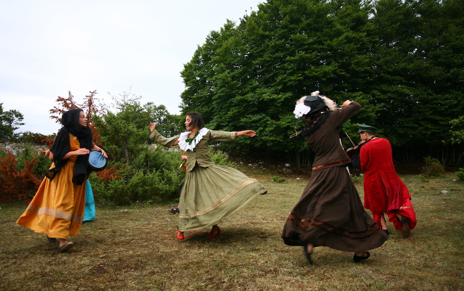 DANZO’ DANZO’ è uno spettacolo teatrale itinerante che mette in relazione il bosco, dal tramonto al buio, con alcune tra le più note fiabe della tradizione: Scarpette Rosse, Manawee, Pelle di foca-Pelle d’anima, La Loba e la Donna Scheletro, scelte e interpretate, nel libro Donne che corrono con i lupi, dalla psicoanalista junghiana Pinkola Estés. C’è un mondo magico e iniziatico evocato dalle fiabe che appartiene tanto alle metamorfosi della psiche quanto ai suoi processi di trasformazione legati agli elementi e alle forze della natura. Nelle corrispondenze tra mondo interno e mondo naturale nascono le azioni teatrali, i racconti, i canti. Le musiche originali dello spettacolo, canti polifonici e composizioni strumentali, restituiscono l’anima delle terre da cui le fiabe sono scaturite e quest’anima s’intreccia alla sensibilità contemporanea, ricca di risonanze e contaminazioni culturali. Da più parti s’invoca il binomio ‘donna/terra’ come embrione per una possibilità salvifica di questo nostro pianeta lanciato verso la distruzione e la scomparsa della propria anima. In Danzò Danzò le attrici colgono la sfida di entrare nel corpo del bosco con il proprio corpo, ingegno artistico e cuore, per riportarne qualcosa in grado di cominciare a curare.